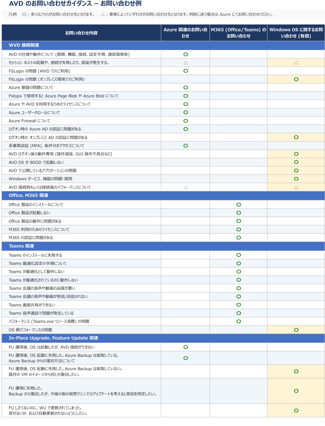 Azure 基盤や AVD サービスにおいての多くは Azure 窓口での受付となりますが、Windows OS 観点や Windows OS 上の Office 製品、M365 に関するお問い合わせは窓口が異なってまいります。