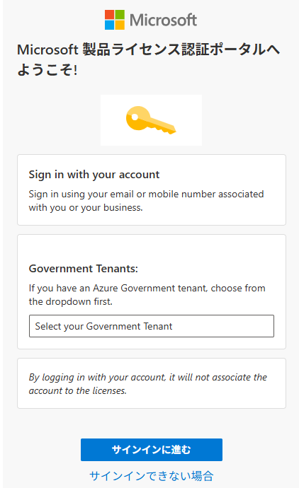 サインイン完了後 [Microsoft 製品ライセンス認証] 画面が表示されますので、[Microsoft 製品のライセンス認証を行う] を選択します。