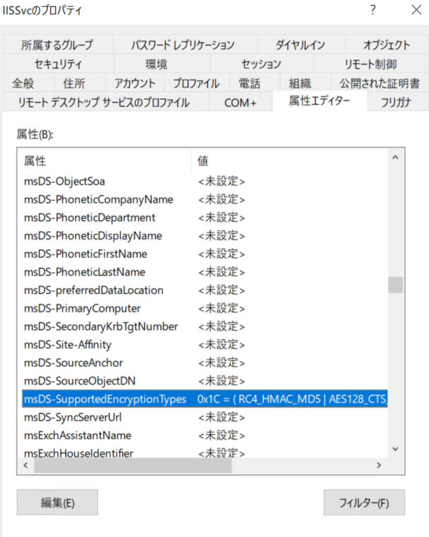 - 「属性エディター」タブ - msDS-SupportedEncryptionTypes をRC4 を含むように (0x1C など) に編集します。