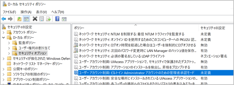 ⇒ ユーザー アカウント制御: ビルトイン Administrator アカウントのための管理者承認モード