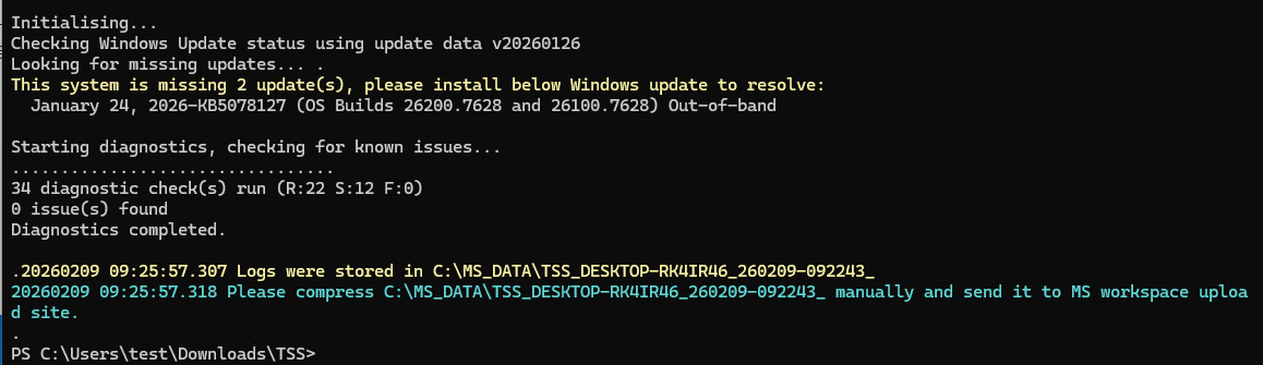 「==> Please compress C:\MS_DATA\TSS_XXXX_XXXXXX-XXXXXX_ manually and send it to MS workspace upload site.」
